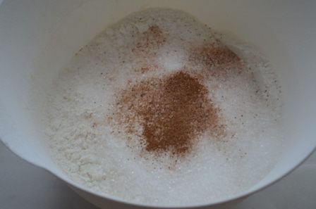 Соединить в большой миске муку, специи (их должно быть в совокупности 1 ч.л. в списке ингредиентов я привела примерное количество специй в граммах, так как с новой системой по иному написать сложно., то есть берем сухие специи по списку в одинаковых пропорциях, в общей массе их должно быть 1 ч л) и коричневый сахар.