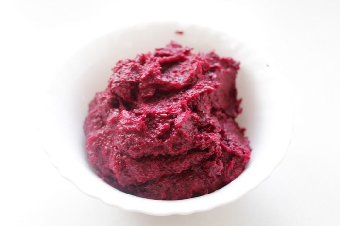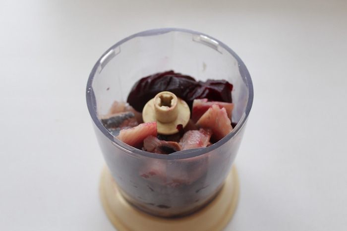 Филе сельди и отваренную свеклу нарезать небольшими кусочками и поместить в блендер.