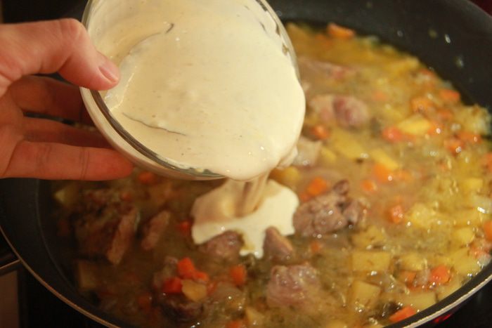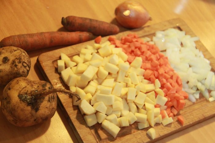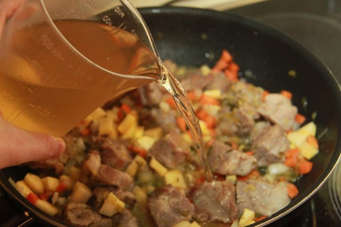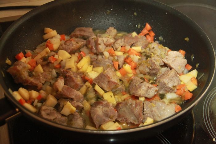 К мясу добавить лук-порей, обжарить, затем репчатый лук, тоже слегка обжарить. Затем добавить репу и морковь.