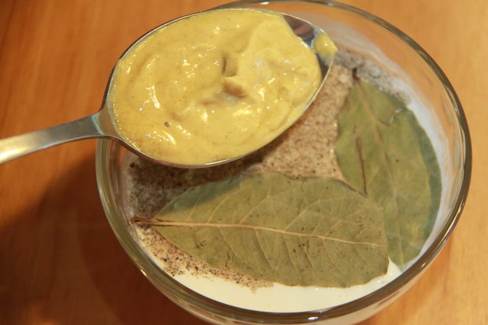 Соединить крем-фреш (или сметана+сливки в равных частях), дижонскую горчицу (ядрёная горчица типа "Сарепты" здесь не подойдёт. Хотя на вкус и цвет...) и муку. Добавить к смеси соль (примерно 1 ч.л. с верхом), чёрный молотый перец и лавр.