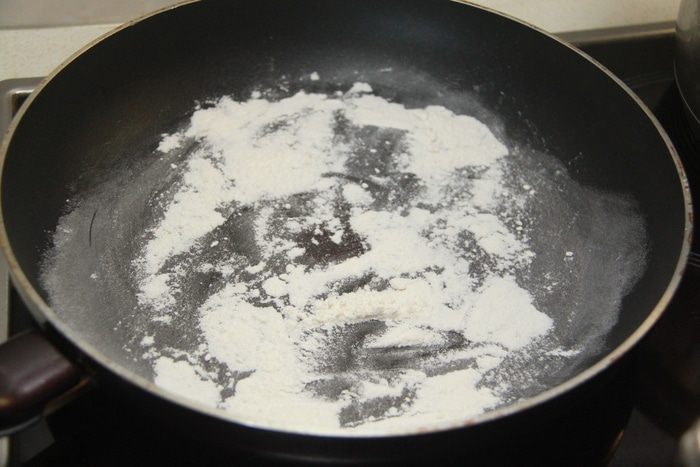 Муку поджарить на сухой сковороде до светло-кремового цвета (примерно 3 минуты).