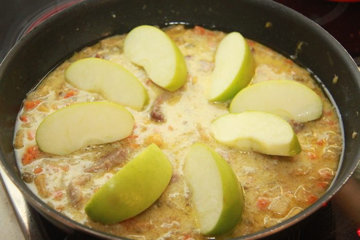 Добавить яблоки (лучше брать кислые сорта), разрезанные на 6-8 долек, готовить ещё 15-20 минут под крышкой. Яблоки должны стать мягкими, а соус загустеть. Подавать горячим, но мне нравится это блюдо на второй день - становится ещё вкуснее, насыщеннее! Приятного аппетита!