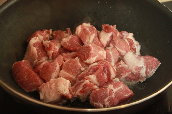 Нарезать свинину (чтобы было менее жирно, можно взять филейную часть, карбонад или корейку без костей, можно брать не 1 кг, а меньше, 500-700г) на средние куски, слегка посолить-поперчить, обжарить в сотейнике до золотистой корочки.