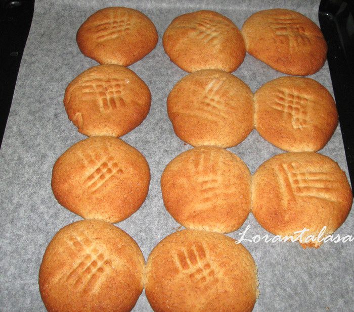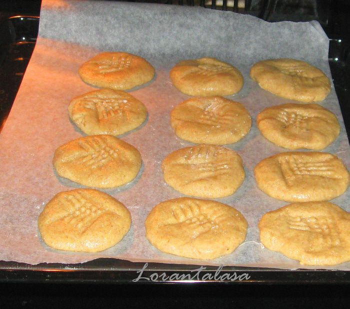Сделать из теста совсем небольшие шарики. Выложить на противень, на расстоянии около 3-х см друг от друга. Нанести отпечаток вилкой.