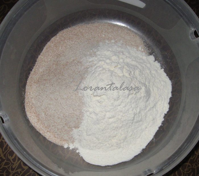 Отмерить и просеять муку в/с, смешать с цельнозерновой мукой. Добавить щепотку соли и разрыхлитель. Взбить размягченное сливочное масло с сахаром. Добавить мед и яйцо, взбить все вместе. Ввести сухие ингредиенты.