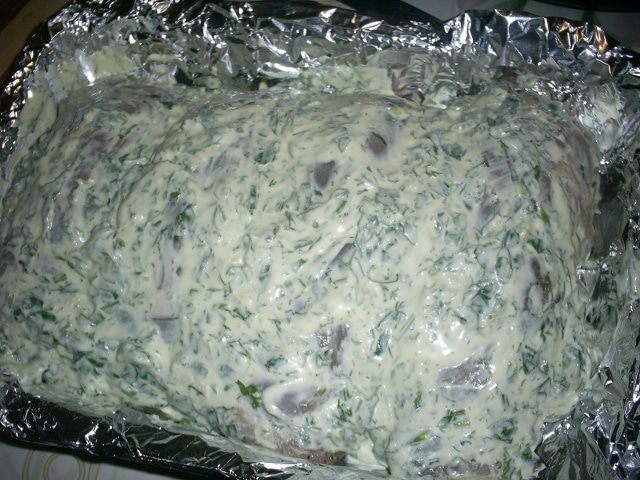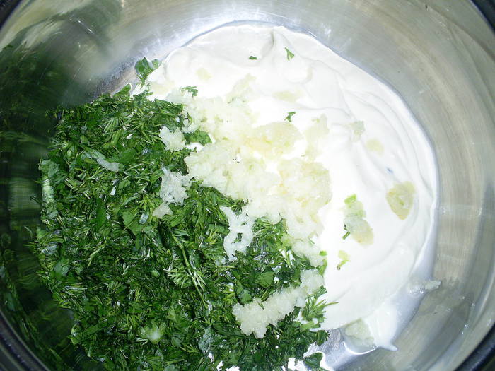 Для соуса сметану смешиваем с мелко нарезанной зеленью, лимонным соком, чесноком, пропущенным через пресс для чеснока. Все хорошенько перемешать, посолить и поперчить по вкусу.