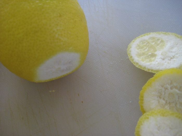 У лимонов отрезать один край, чтобы они устойчиво стояли