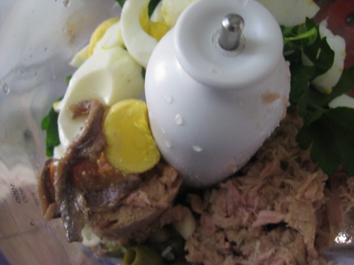 В кухонном комбайне измельчить тунец, оливки, каперсы, чеснок, петрушку, яйца, добавить сок лимона и майонез. Посолить и поперчить по вкусу. Начинка готова