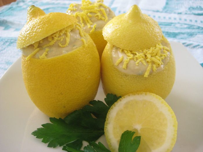 Лимоны заполнить начинкой. Украсить тертым желтком и петрушкой. Приятного аппетита!!