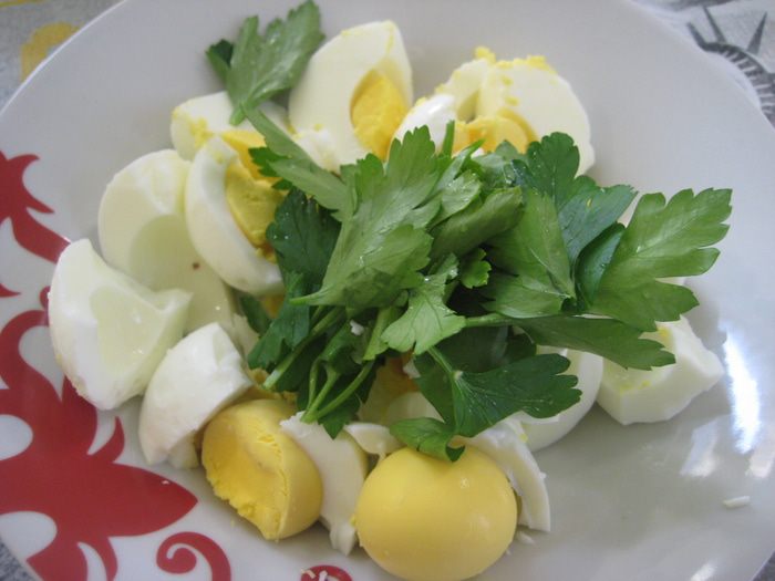Яйца отварить вкрутую, почистить, один желток оставить для украшения
