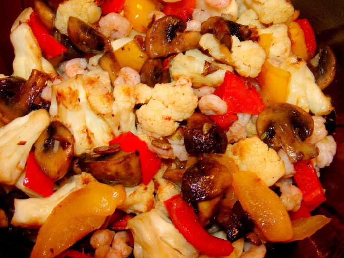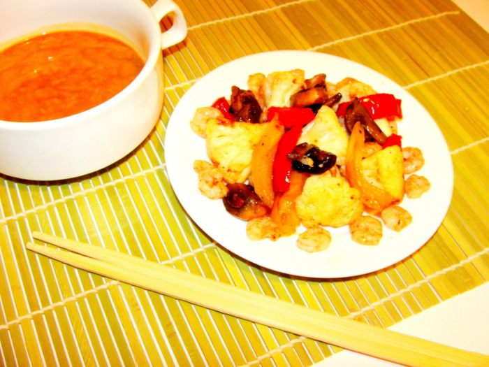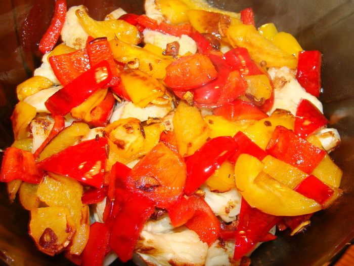 Муку обжарить до золотистого цвета, смешать с соусом соевым, водой и бальзамическим уксусом. Залить получившимся соусом овощи. Дать настояться 5 минут, перемешать.