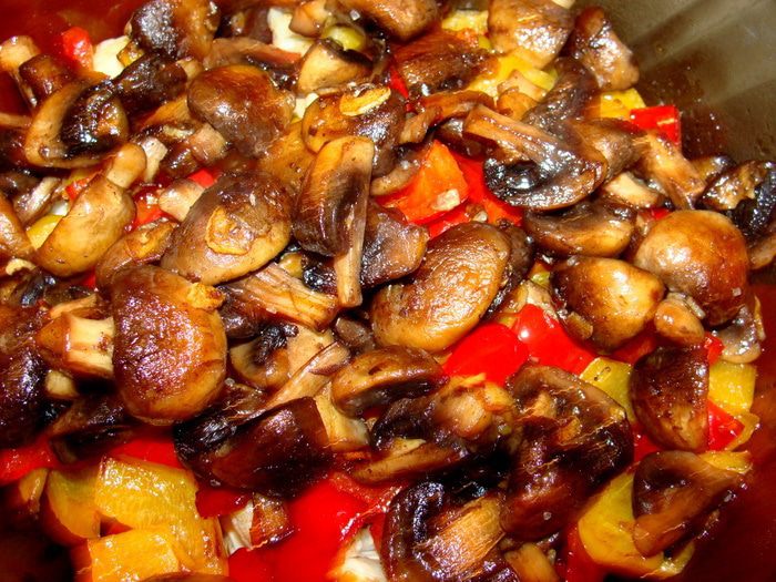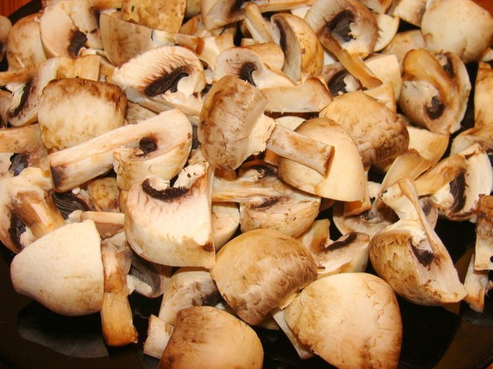 Мелкие шампиньоны порезать пополам, крупные на 4 части.