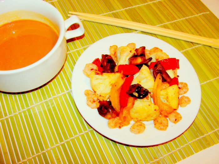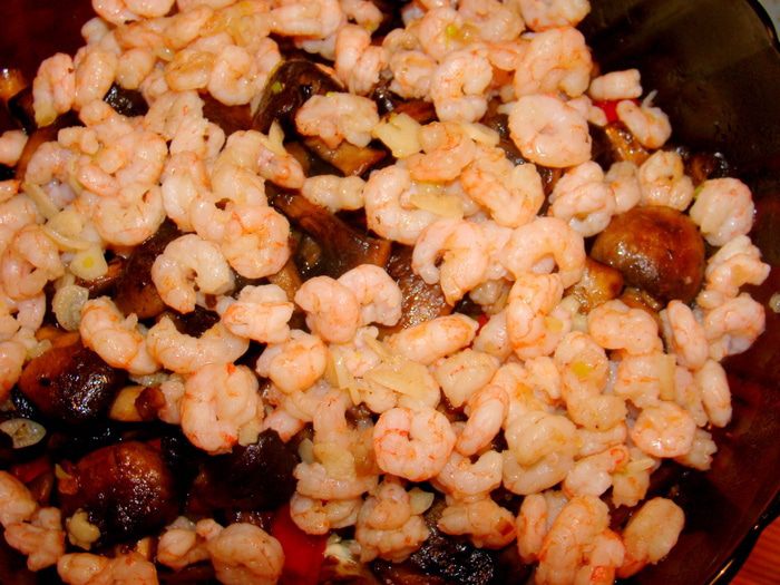 Креветки разморозить, обсушить, обжарить с чесноком.