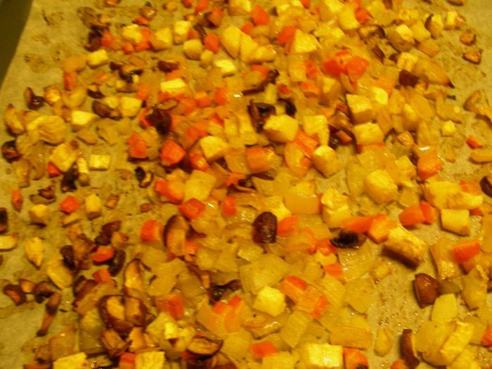 Противень застилаем бумагой для выпечки и выкладываем на него овощи в один ряд. Запекаем их минут 50 до золотистого цвета, периодически перемешивая.