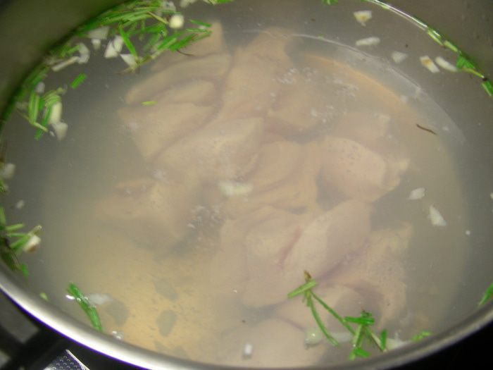 В кастрюлю вливаем бульон, добавляем куриное филе, измельченный чеснок и розмарин (свежий или сушеный), соль по вкусу. Доводим до кипения, уменьшаем огонь и готовим на маленьком огне 30 минут (удобно это делать параллельно, пока овощи запекаются).