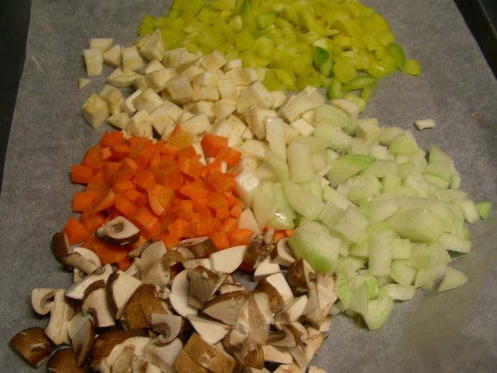 Разогреваем духовку до 190 гр. Овощи и грибы режем кубиком. В большой салатнице перемешиваем овощи и добавляем оливковое масло. Перемешиваем, чтобы оно покрыло все овощи.