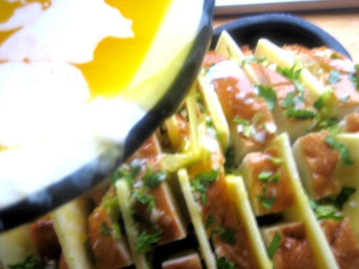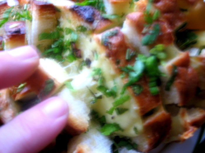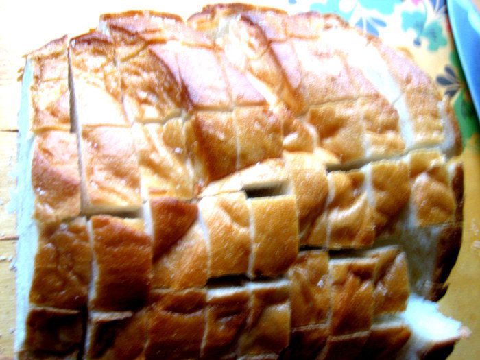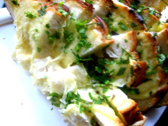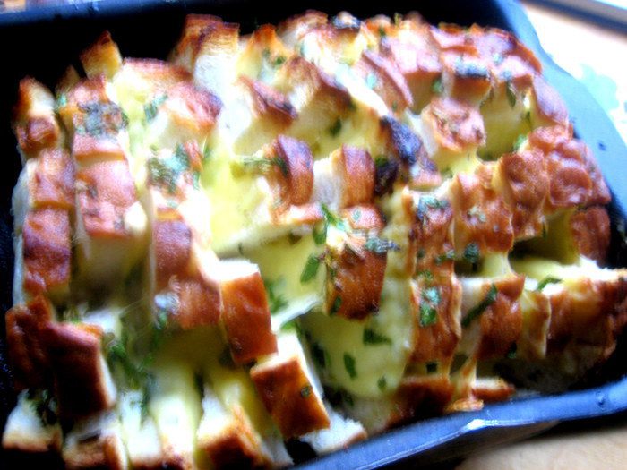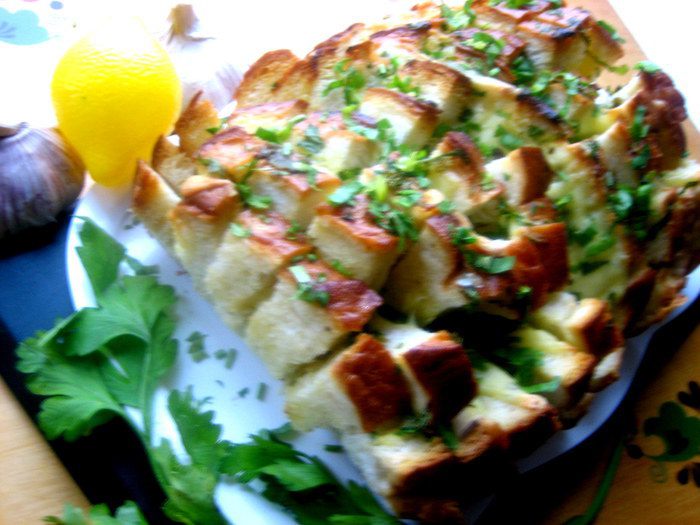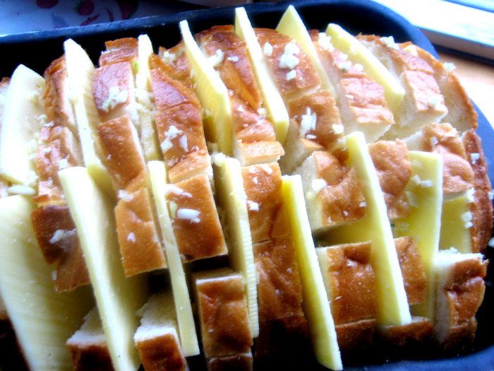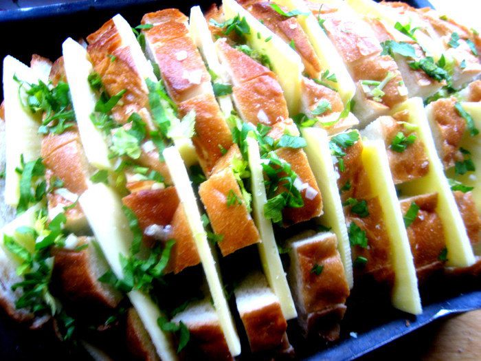 Берём вчерашний батон... и получаем тёплую закуску с восхитительным ароматом и хрустяшей корочкой)))