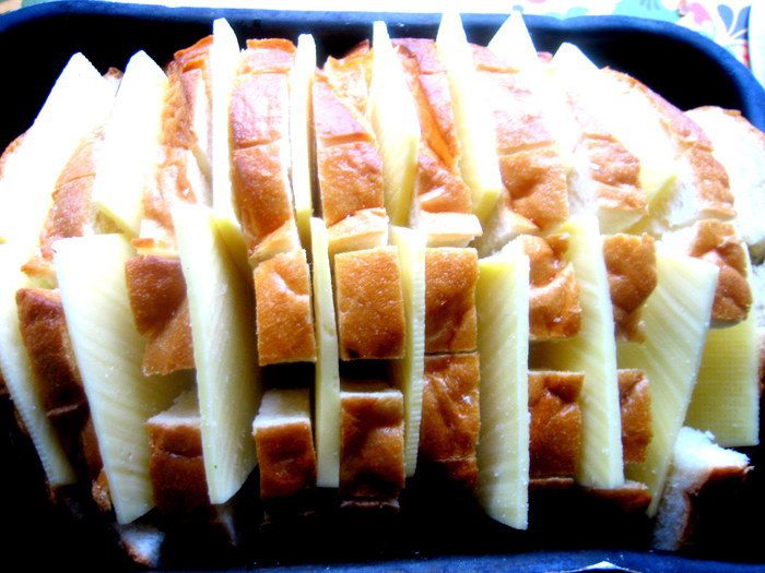 Помещаем хлеб в смазанную форму,раздвигаем слегка куски и всовываем по два кусочка сыра между ломтями.