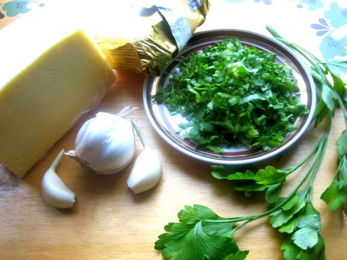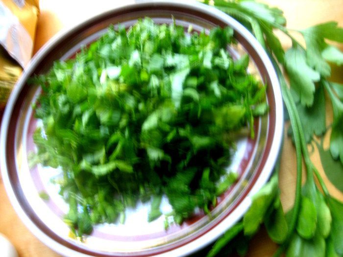 Зелень порубить любую. Можно зелёный лук. У меня петрушка и листочки сельдерея.