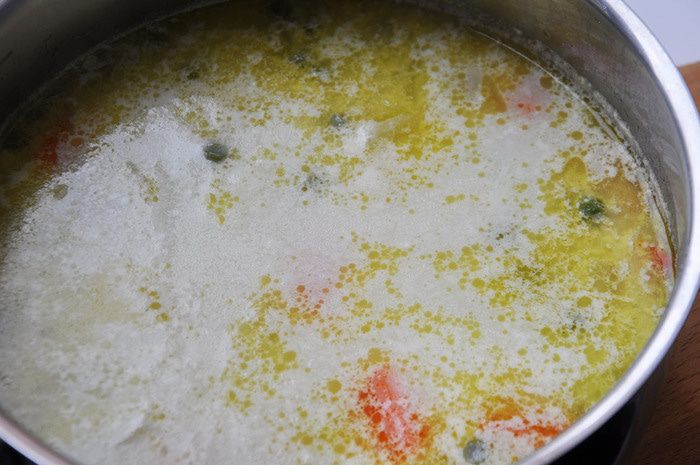 Сварить все овощи крупными кусочками в бульоне. За 10 минут до конца варки добавить горошек. Посолить, налить масло и сливки и прокипятить минутку.