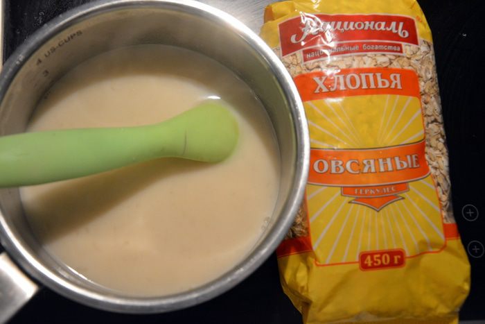 Подогреть овсяную жидкость на огне, постоянно помешивая.