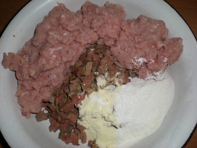 Мясо необходимо измельчить в фарш. Можно это проделать с помощью мясорубки или блендера. Я использовалал блендер. К фаршу добавить кусочки куриной печени, пшеничную и кукурузную муку. Влейте молоко. Смешайте ингредиенты ложкой.
