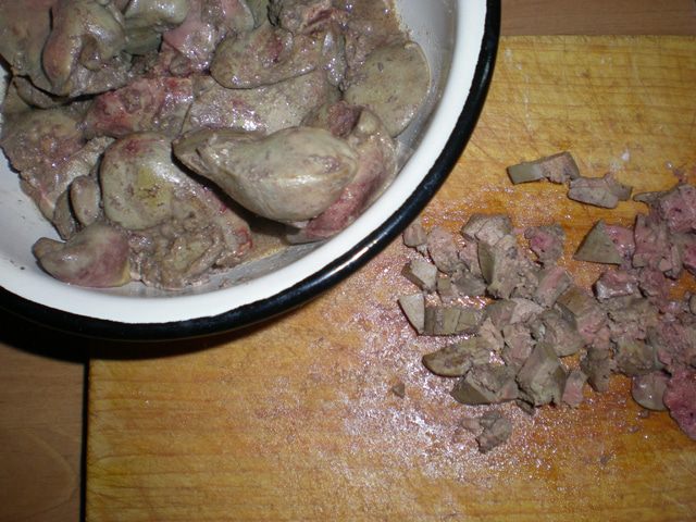 Куриную печень необходимо обжарить на сливочном масле 3-4 минуты. Не солите, чтобы печень не была сухой. Остудить и нарезать небольшими кусочками. Сок от жарки печени не выливайте. Мы его потом добавим в фарш.