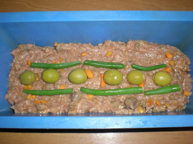 Выложите в силиконовую форму треть фарша, разложите морковку, фасоль и оливки.