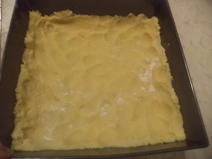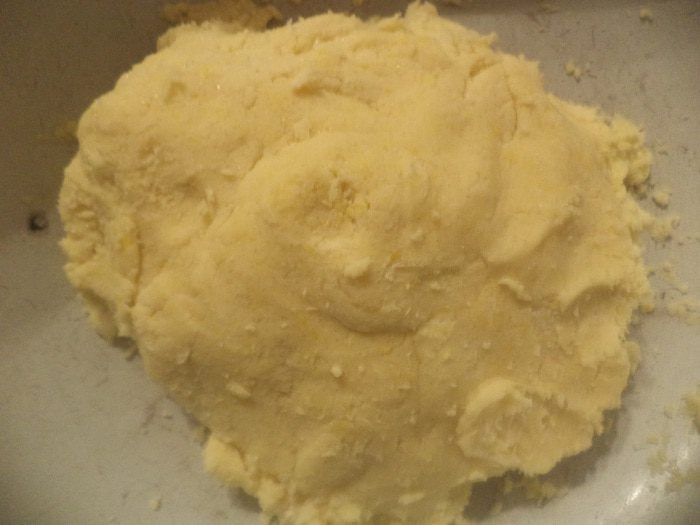 Муку перемешать с разрыхлителем, сахаром и натёртой на мелкой тёрке лимонной цедрой. Охлаждённое сливочное масло натереть на крупной тёрке, добавить к муке и растереть в крошку. Добавить желтки, 2 ст. лож. холодной воды, замесить тесто.