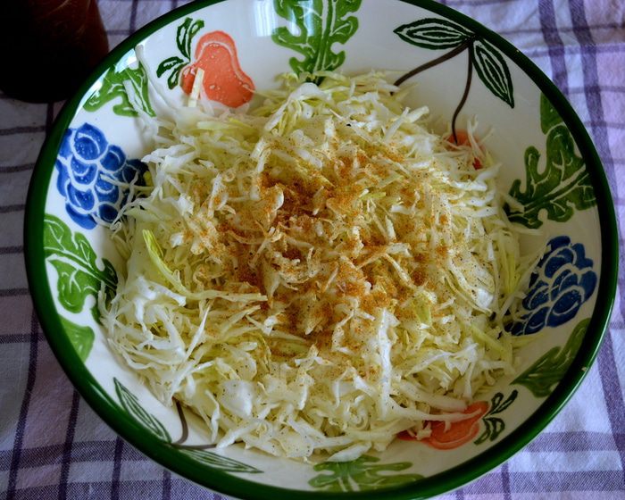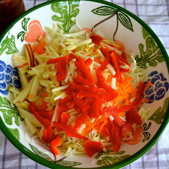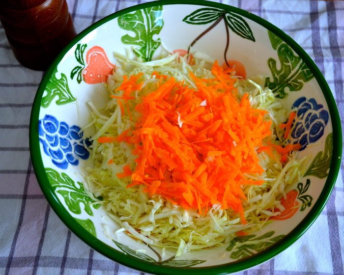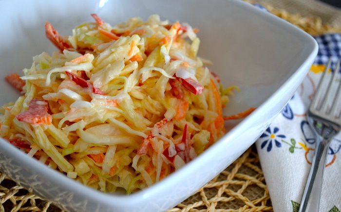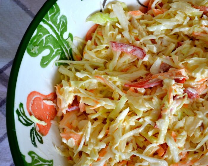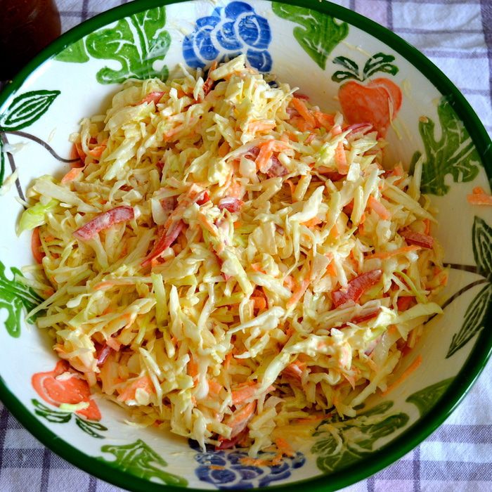 Еще в интернете нашла такую историю этого салата: «История Коул-Сло уходит корнями в Римскую империю, где подобный салат подавался как блюдо из капусты, уксуса, яиц и специй. Выходцы из Голландии выращивали капусту в штате Нью-Йорк на берегах реки Хадсон и подавали ее нарезанной в салате, который называли koolsla (kool -- капуста, sla -- салат). Вариации капустного салата и с уксусом, и с майонезом имеют в штатах богатую историю. Поскольку майонез был придуман в cередине 18 века, то последней версии американского Коул-Сло всего 250 лет.»