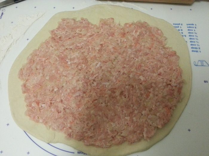 Кабачок нарезаем мелко, добавляем 100 мл воды и измельчаем до пюреобразного состояния в комбайне. Добавляем соль, яйцо и 3 ст.л. растительного рафинированного масла, просеиваем муку частями и замешиваем тугое тесто (муки может уйти меньше или больше). После расстойки оно становится очень мягким. Квашеную капусту еще немного режем ножом, смешиваем с фаршем, солим, добавляем любимые специи.