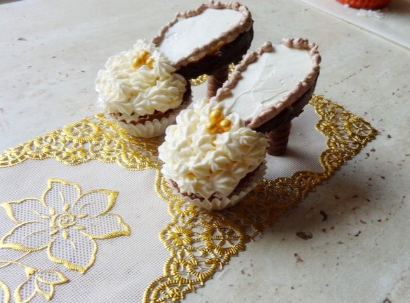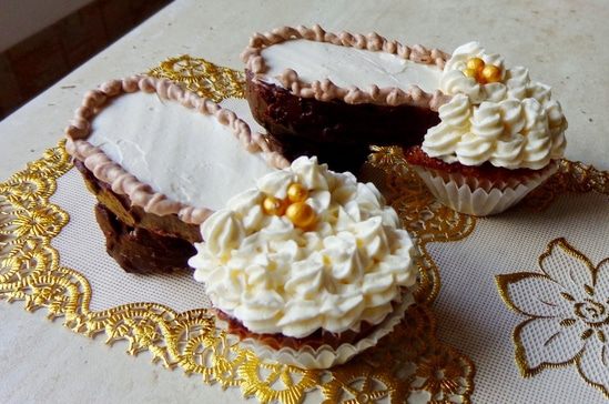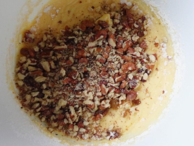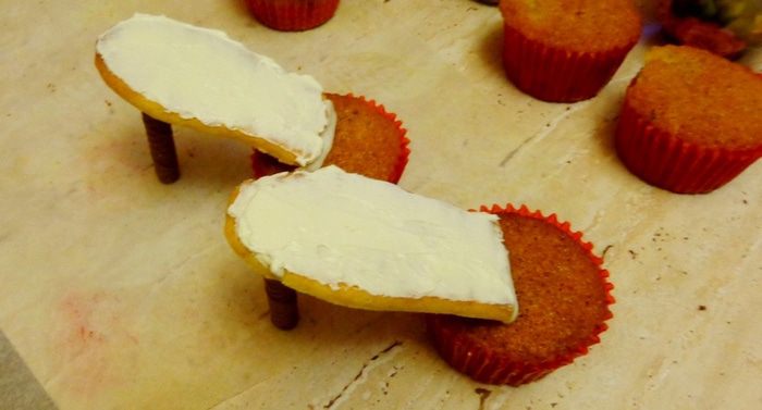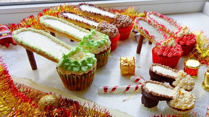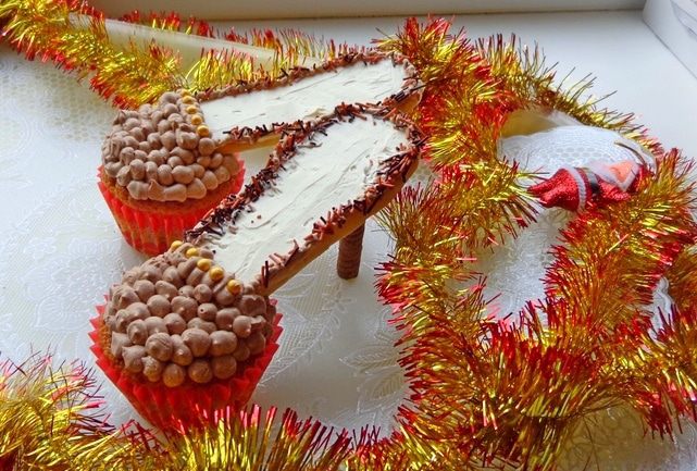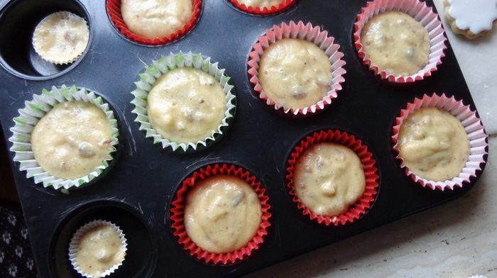 Сделать кексы по вашему любимому рецепту. Я делаю так: 150 г мягкого масла взбиваю со 180 г сахара и ванильным сахаром, по одному ввожу 3 яйца, добавляю 1 ч.л. разрыхлителя и 4 ст. л муки. Чтобы было повкуснее, добавляю по полстакана изюма и толченых орехов.