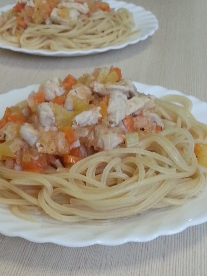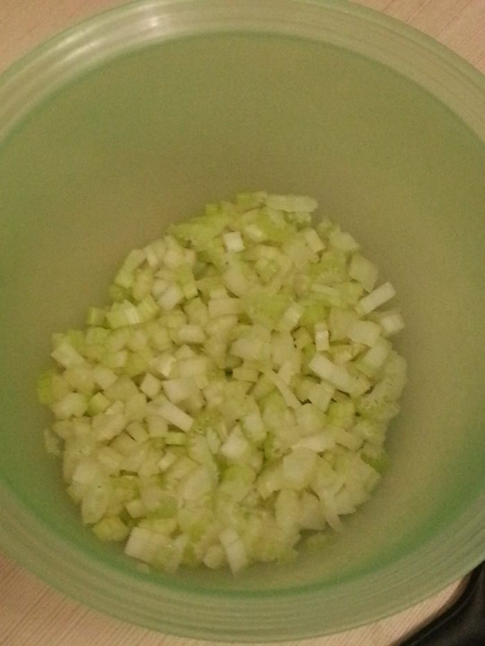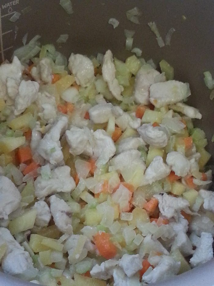 Сельдерей и кабачок добавляем к моркови и луку, обжариваем 2-3 минутки, добавляем курицу, солим. Оставляем тушиться на слабом огне минут 20 (я готовила в мультиварке - включила режим "Суп/Каша на 20 минут).