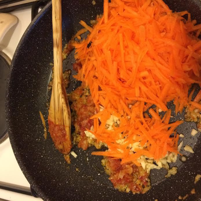Лук, чеснок потушить на растительном масле. Добавить томатную пасту, перемешать. Добавить морковь, перемешать и тушить под крышкой 5 минут.