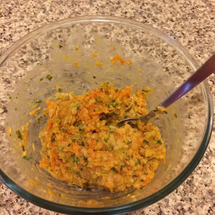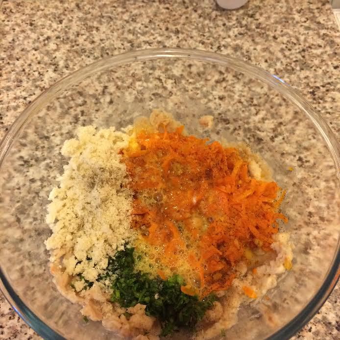 В фасоль добавить тушеные овощи, хлебную крошку, зелень, соль, перец и слегка взбитое яйцо.