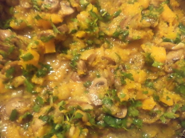 К луку с тыквой добавить обжаренные грибы, добавить соль, перец, лавровый лист и протушить ещё 5-10 минут.