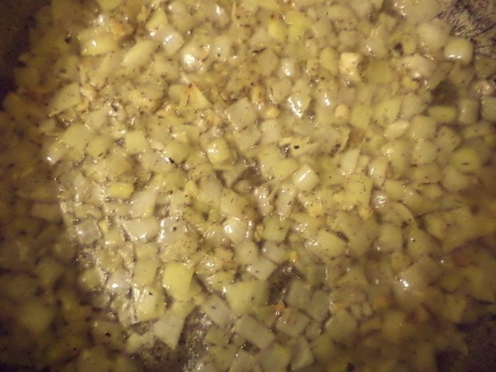 Луковицу почистить и нарезать средними кубиками. Чеснок почистить и мелко нарезать. Разогреть в сковороде 3 ст. л. растительного масла, выложить лук, чеснок и прованские травы. Обжаривать до прозрачности лука.