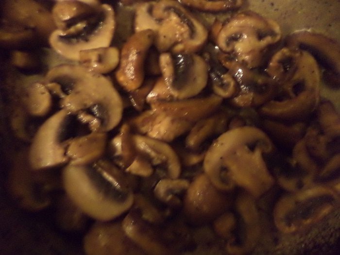 Грибы порезать. В другой сковороде разогреть 3 ст. л. растительного масла, выложить грибы, посолить, поперчить и обжарить.