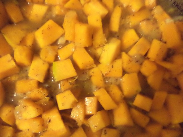 Тыкву нарезать кубиками. К луку добавить тыкву, влить 1.5 стакана горячей воды, накрыть крышкой и тушить 15-20 минут.