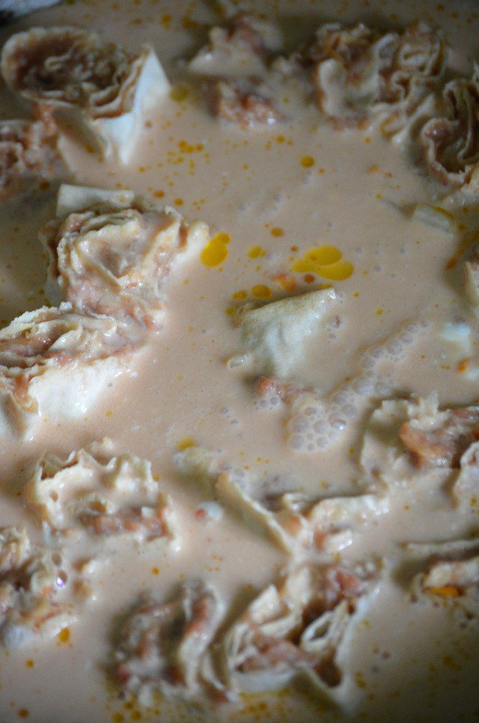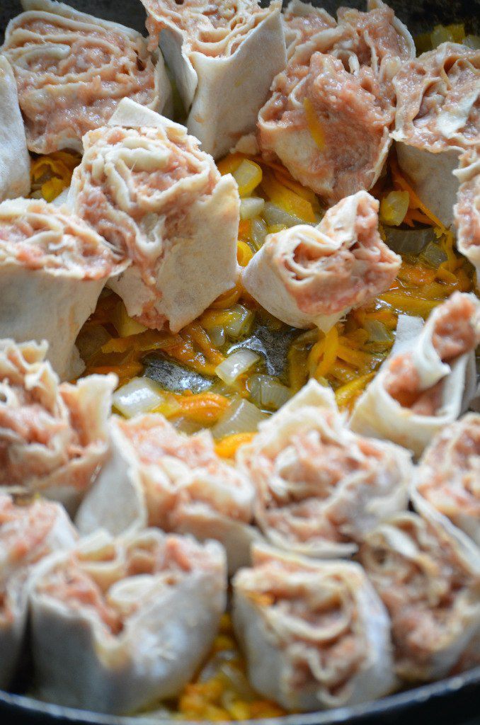 Для соуса: смешать сметану, томатный соус, добавить соль, перец по вкусу. Влить стакан кипятка в соус, перемешать.Залить рулетики приготовленным соусом, плотно закрыть крышкой и тушить на медленном огне 20 минут. Выключить и еще минут 10 не открывать крышку. По желанию посыпать зеленью.