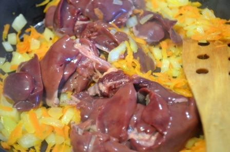 Добавить крупно нарезанную печенку к овощам и обжарить все вместе 5 минут. Посолить, поперчить и добавить сахар.