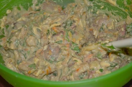 Добавить остывшую печень и зелень в конце, перемешивать.