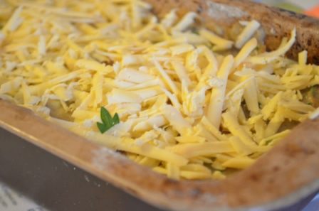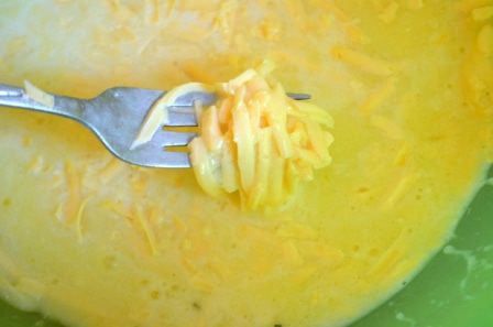 Добавить туда теплое молоко и 100 г сыра. Пермешать.