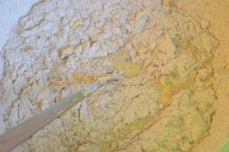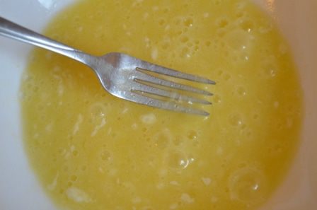 Вилкой взбить яйца, оливковое масло и разрыхлитель.