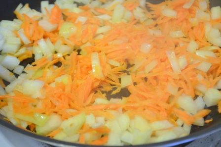 Лук нарезать на кубики, морковь натереть на крупной терке.
