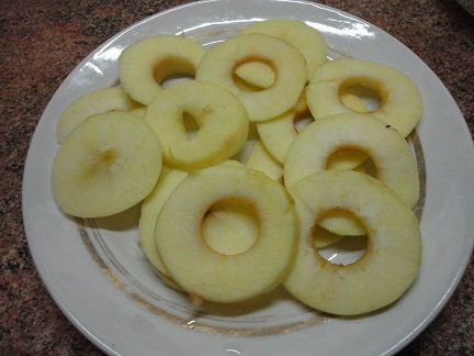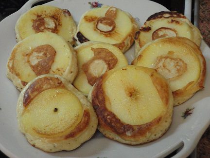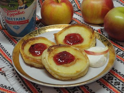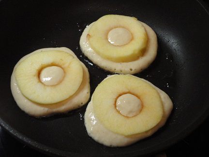 На УМЕРЕННО (! это важно для того, чтобы оладьи в большей степени прожарились на первой стороне) разогретую сковороду с небольшим количеством растительного масла (даже если она с антипригарным покрытием) выливаем столовую ложку теста и выкладываем кружочек яблока, накрываем крышкой. Когда первая сторона зарумянилась, переворачиваем вместе с яблоком и допекаем до готовности.