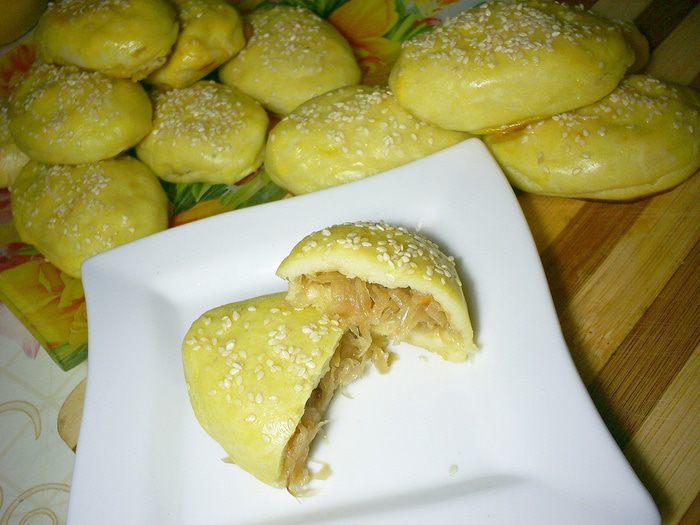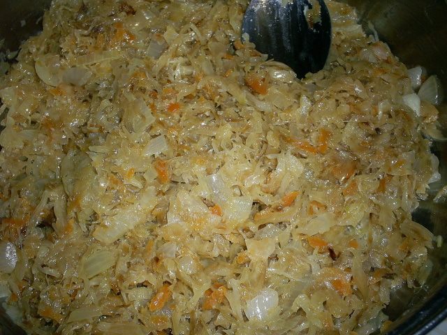 Заранее позаботимся о начинке. Она должна успеть остыть. Лук мелко режем и обжариваем до прозрачности, добавляем натертую на крупной терке морковь и жарим до полуготовности. Затем добавляем на сковороду отжатую квашеную капусту, перемешиваем и тушим под закрытой крышкой 20-25 минут на медленном огне. Периодически помешиваем, чтоб не пригорело, если нужно, добавляем соль, сахар по вкусу. Можно налить пару ложек воды, чтобы капуста лучше протушилась.