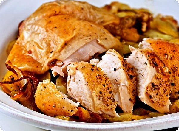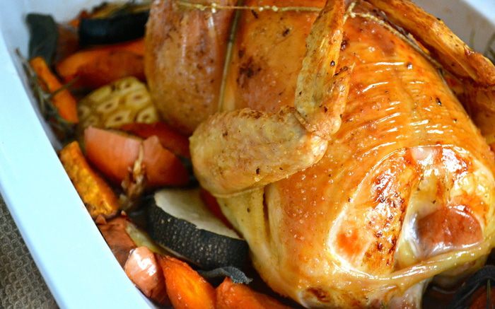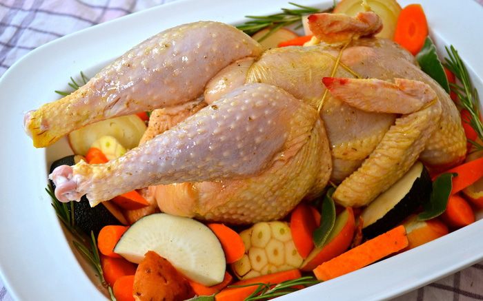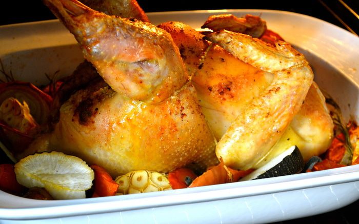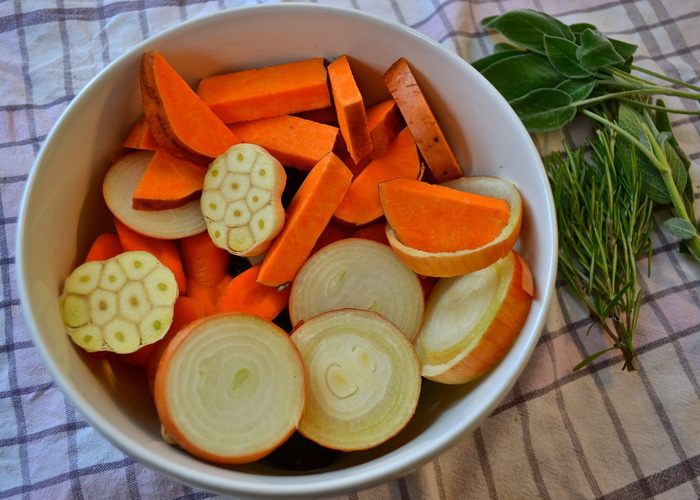 Цыпленка достать из холодильника за 30 минут до начала приготовления. Затем включить духовку на 240 С. Овощи мы не будем чистить, а только как следует вымоем и нарежем крупными кусками (дольками, кружочками, брусочками, как Вам будет угодно...)))) Головку чеснока тоже вымыть и разрезать поперек пополам... Вымыть и высушить ароматные травки. В принципе, набор овощей у Вас может быть любой..., подходящий Вам по вкусу! ))) Выложить овощи слоем в форму для запекания - противень с высокими бортами (предварительно сбрызнуть дно оливковым маслом)... Посолить и поперчить.