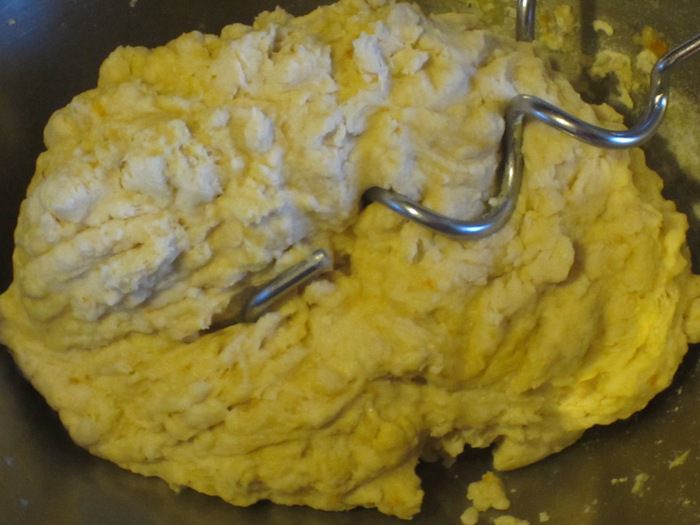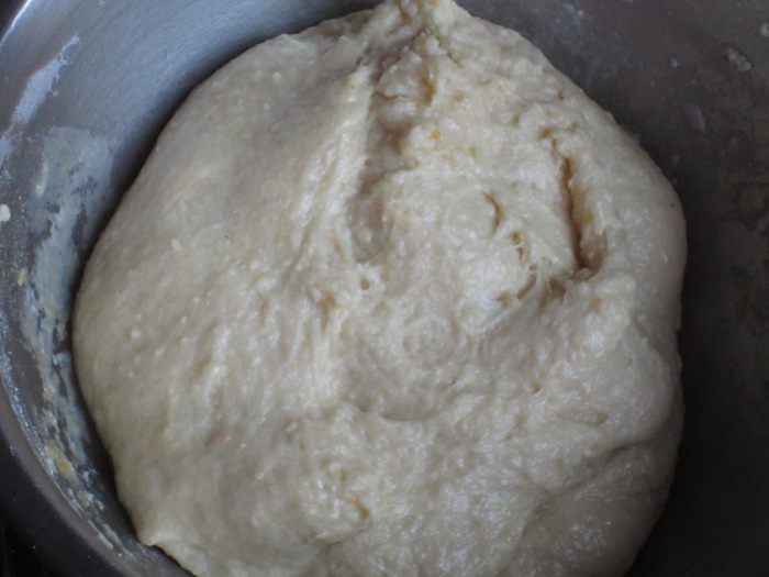 В миску с мукой и опарой добавить яично-молочную массу, ром, сахар и замесить тесто (я это делала миксером с насадками для теста).