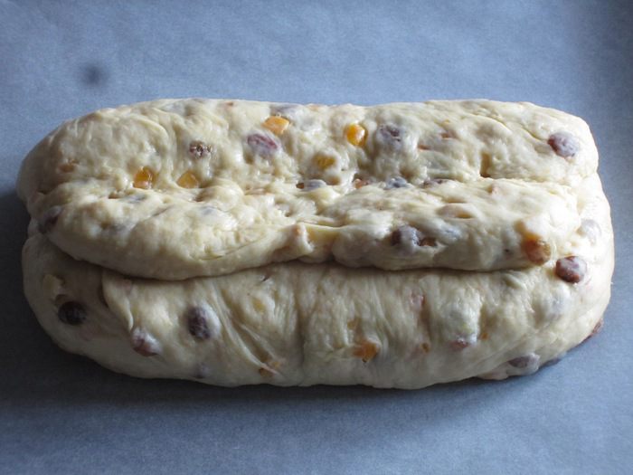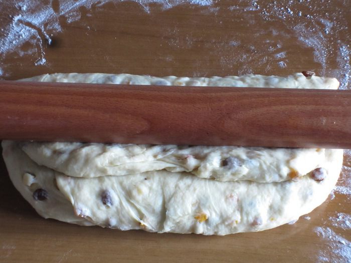 Сложить тесто пополам, причём сверху должна быть раскатанная тонко сторона. Опять сделать скалкой углубление по центру штоллена. Точно так же сформировать второй штоллен.